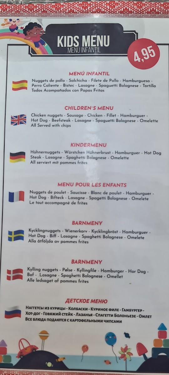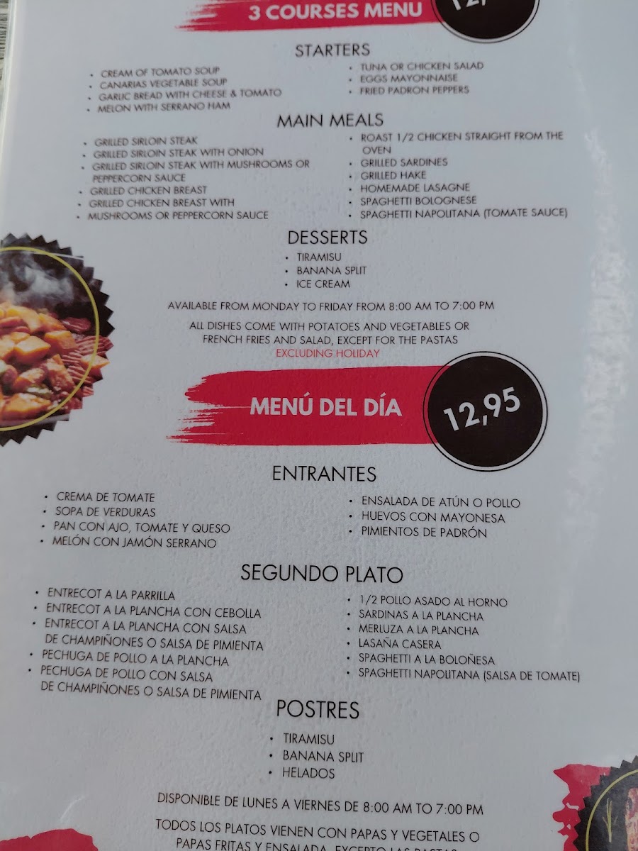 Guests can start their morning with comforting choices like an English Breakfast or enjoy a casual lunch featuring classics such as lasagne, hamburgers with chips, or fresh Canarian-style dishes like papas arrugadas and ensalada canaria. The menu also invites you to linger a bit longer with dishes like entrecot, tagliatelle with scampi, or the catch of the day with fresh lubina.