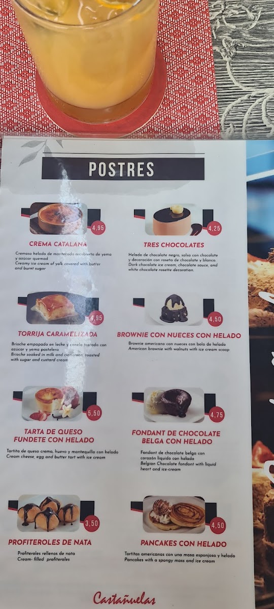Las Castañuelas complements its food with an inviting range of drinks and light indulgences. Whether sipping on a refreshing margarita or a glass of sangria, or enjoying a traditional Barraquito Especial coffee, the drinks help create a laid-back atmosphere perfect for leisurely moments. To finish, simple desserts like cherry bakewell and banana split bring a gentle sweetness to the experience without overwhelming.